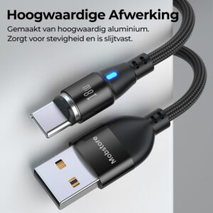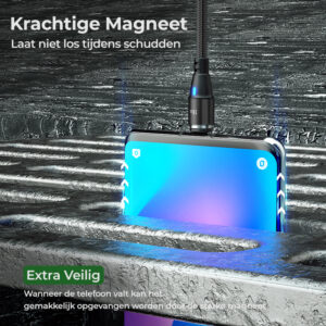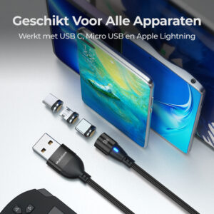 Met deze magnetische oplaadkabel van Mobstore kun je vanaf nu gemakkelijk jouw smartphone of andere apparaten opladen. De kabel wordt geleverd met 3 aanslutingen, namelijk een USB-C aansluiting, een Micro USB aansluiting en een Apple Lighting aansluiting. Je kunt dus elke smartphone hiermee gemakkelijk en snel weer volledig opladen. Gebruik de magnetische functie om stofdeeltjes en vuil weg te houden van je oplaadpoort terwijl je met een simpele klik gemakkelijk weer je smartphone kunt opladen. Zoeken naar je oplaadpoort in de avonden of ongemakkelijke posities is vanaf nu verleden tijd. De magneten in onze kabels kunnen met gemak het gewicht van je smartphone dragen.